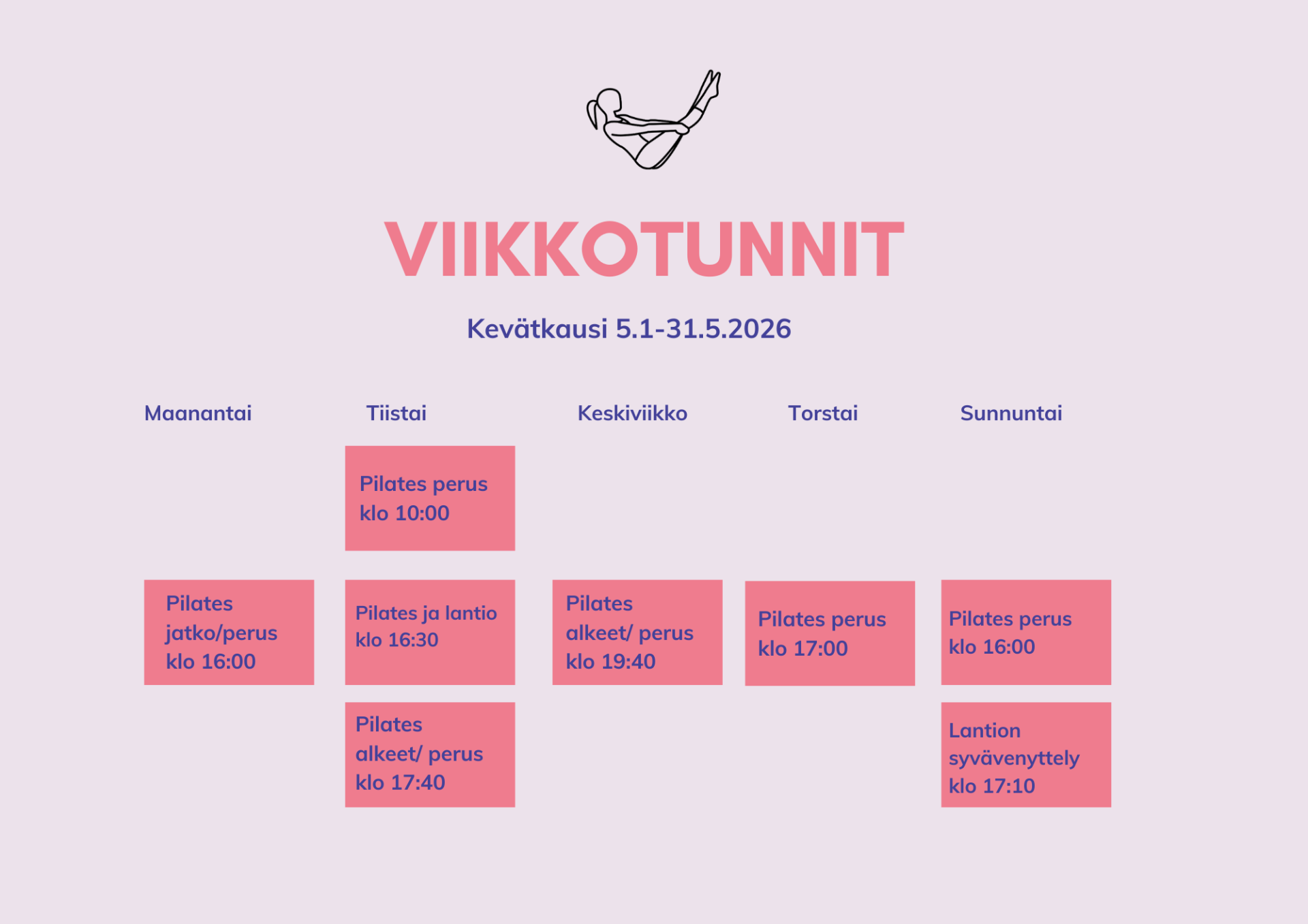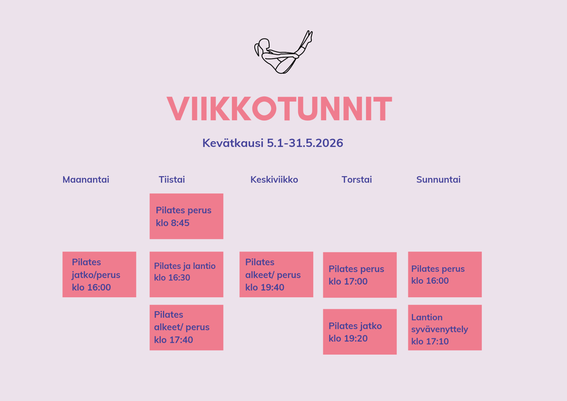 Voit ilmoittautua mille tahansa viikkotunnille, jossa on tilaa. Ilmoittautumalla etukäteen varmistat paikkasi tunnilla ja tuet omaa sitoutumistasi liikkumiseen – se on pieni mutta merkityksellinen teko itsesi ja hyvinvointisi puolesta. Viikkotunneille voi osallistua jäsenyydellä, 10x kortilla tai kertamaksulla